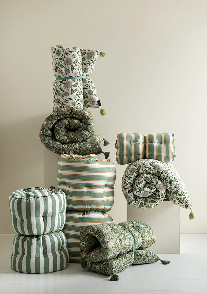 Striped mattress with full-colour woven green stripes – 100% cotton and recycled polyester filling.