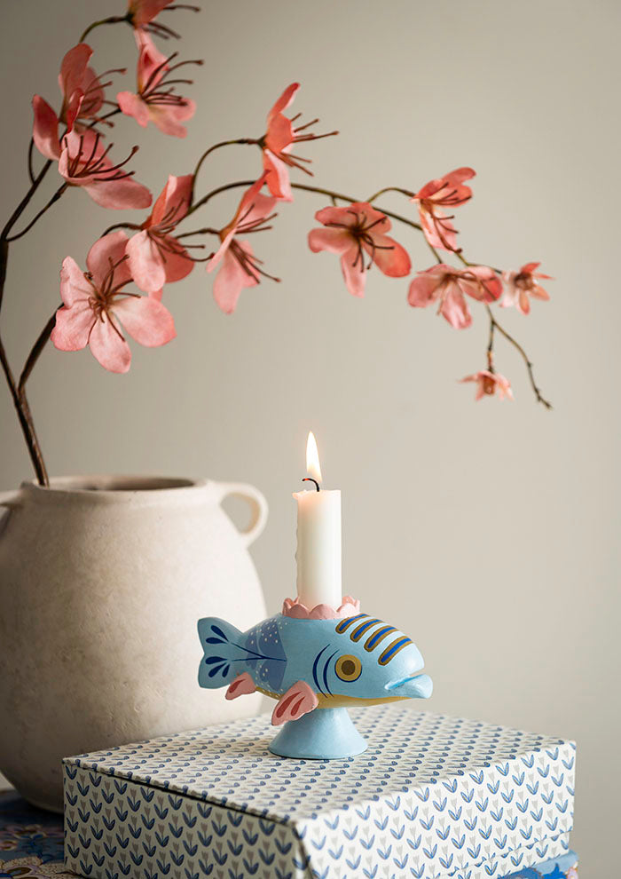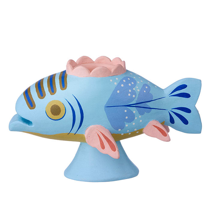 Charming figurine candle holder with fish design and intricate hand-painted details.