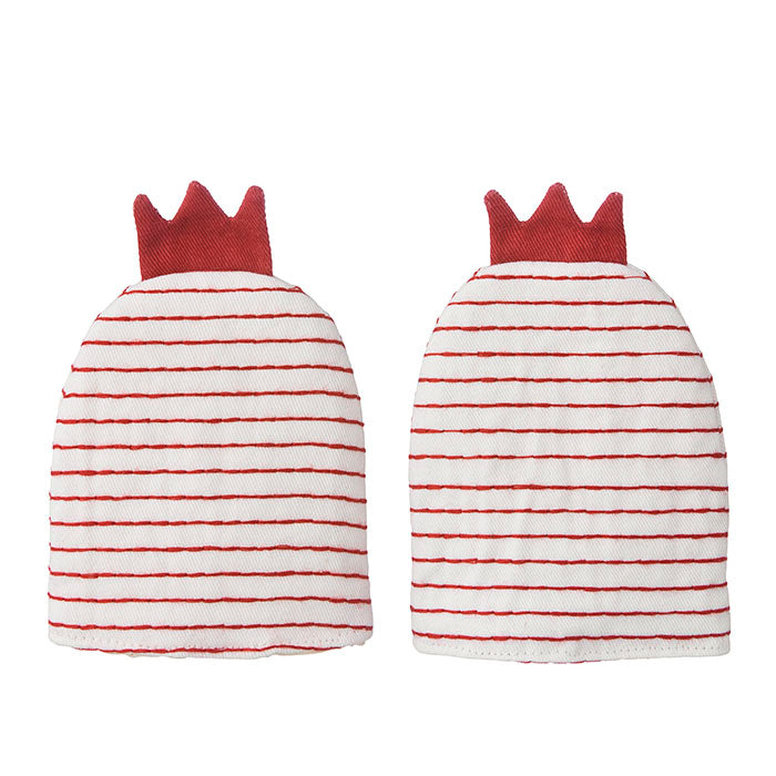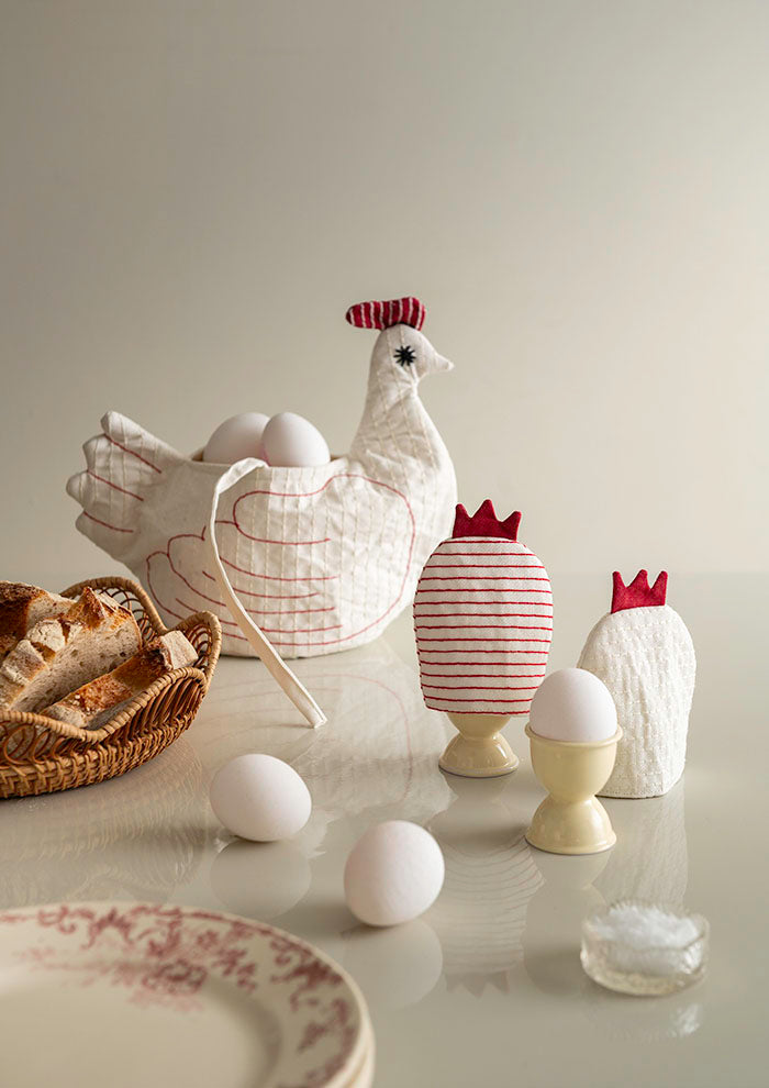 Charming set of 2 egg warmers with delicate stitching details, 100% cotton.